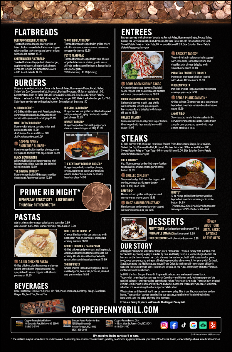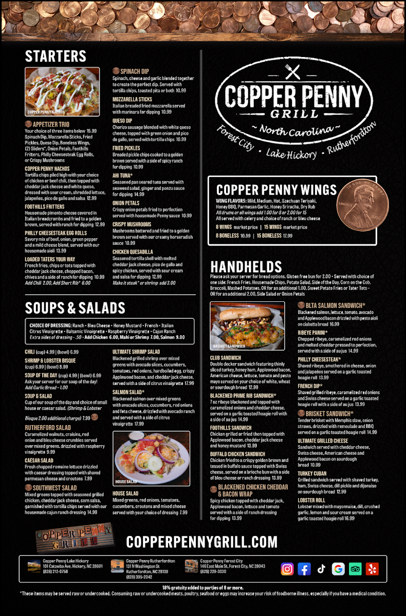 Introducing the menu at Copper Penny Grill Rutherfordton, a delightful culinary destination located at 131 N Washington St, Rutherfordton, NC. This grill offers a diverse and mouthwatering array of dishes that cater to various tastes. The standout item is the Cajun Chicken Pasta, featuring grilled chicken, diced tomatoes, and green onions, all enveloped in a spicy Alfredo sauce—perfect for spice lovers.